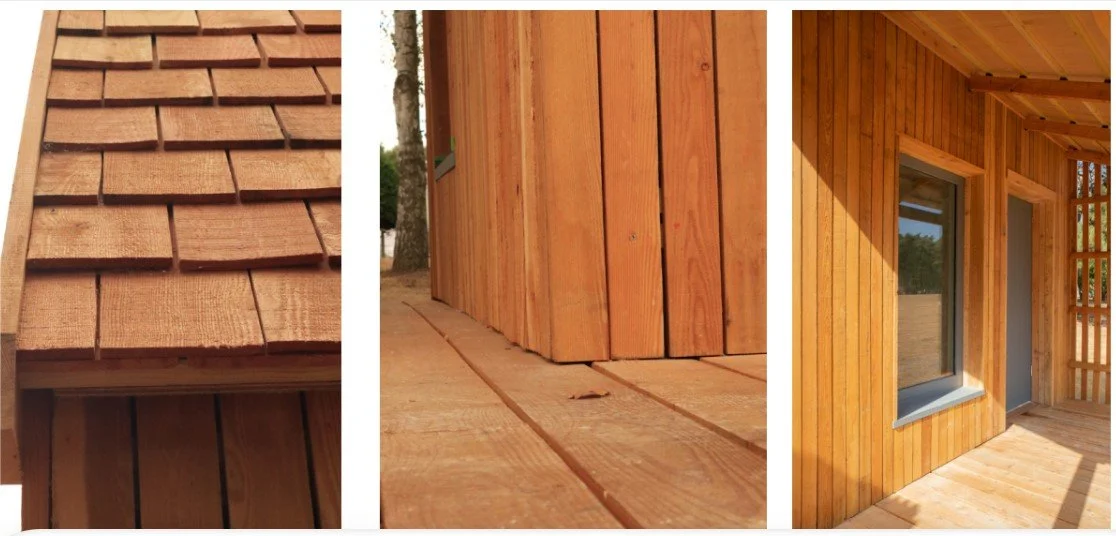 The foundation and base of the structure consists of eight concrete pads with box beams assembled around the perimeter and our NBS wood fibre floor cassettes inserted inside. Our NBS Hempsil wall cassettes and window sections were then installed using spline pegs to secure them to the floor and other wall sections. The roof cassettes and angled box beam sections were then installed. Woodfibre was applied externally on the walls and roof followed by the weatherproof membrane. Next battens were fixed around the membrane on to which larch cladding was mounted. Wooden shingles were installed on the roof. Plasterboard was installed internally and painted with cork floor tiles installed.