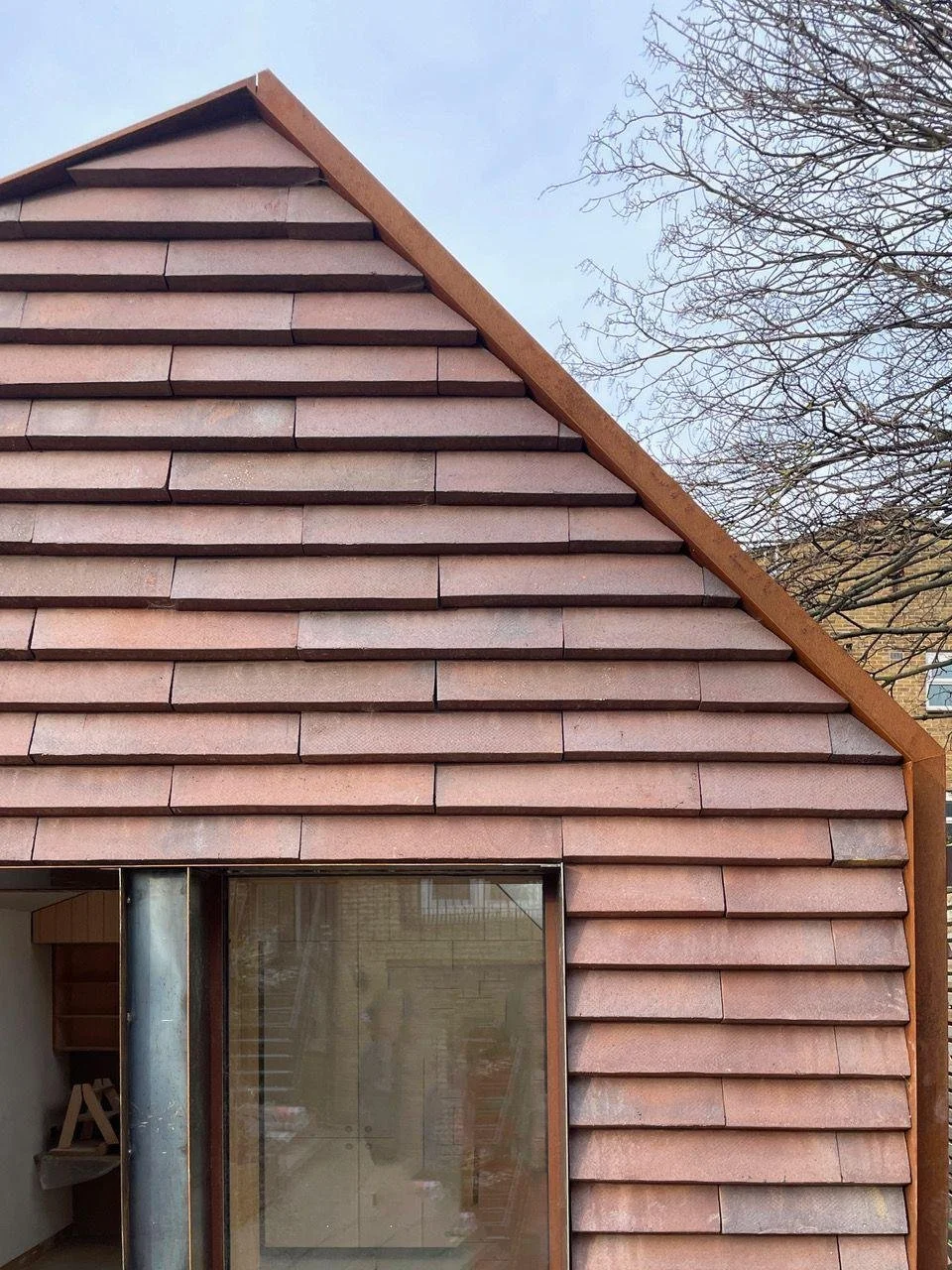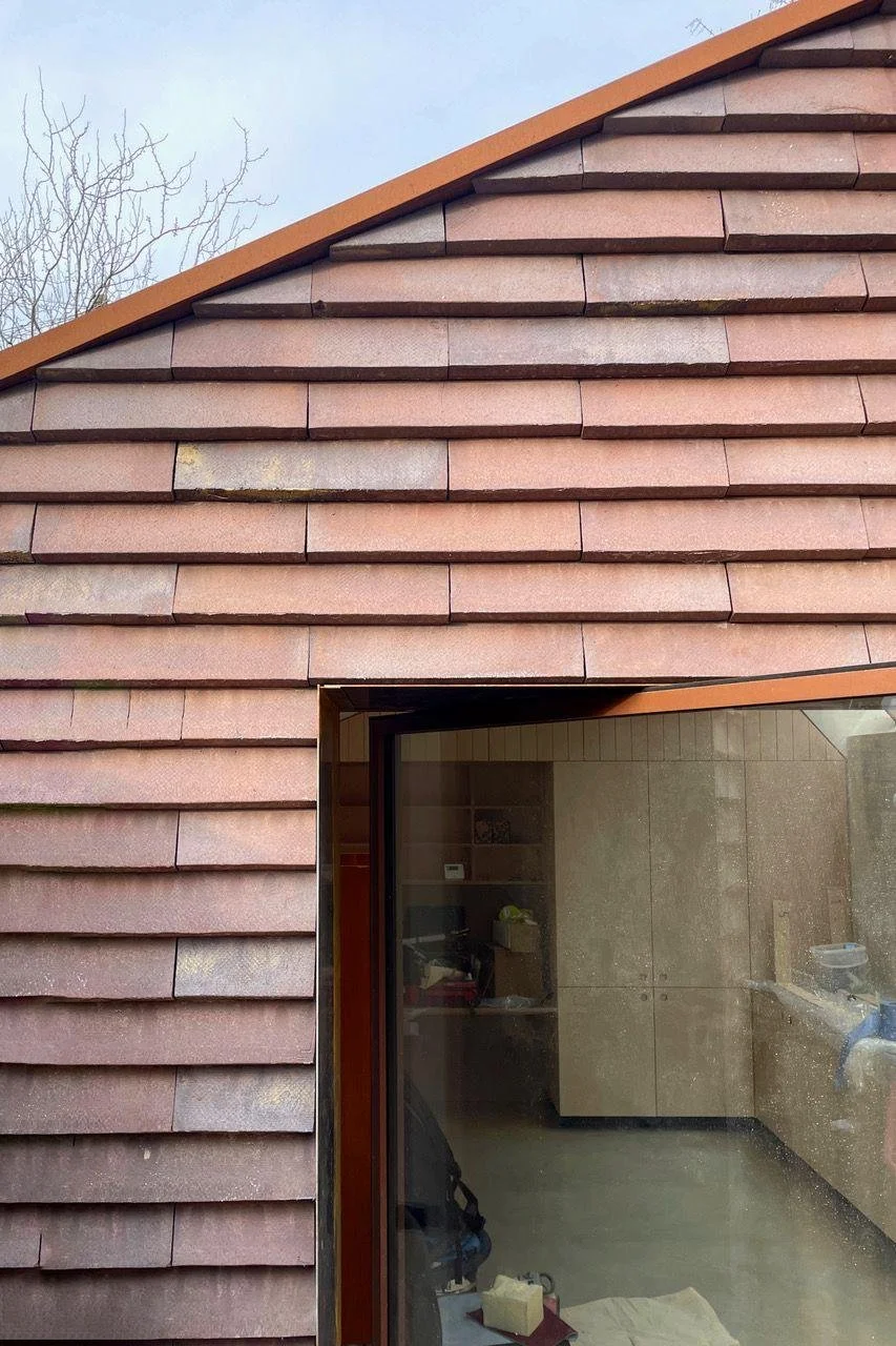 The Greenwood Road photography studio, constructed with ADEPT wall and roof panels, is designed with practicality and natural light in mind. Its uneven-pitched roof includes a north-facing skylight, providing soft, consistent light suited to photographic work. Inside, the compressed earthenware floor and clay plaster finish bring a grounded, natural feel to the space, complemented by custom-built cabinetry that adds essential storage. The result is a workspace that’s functional and quietly cohesive, shaped by materials that feel both practical and inviting.